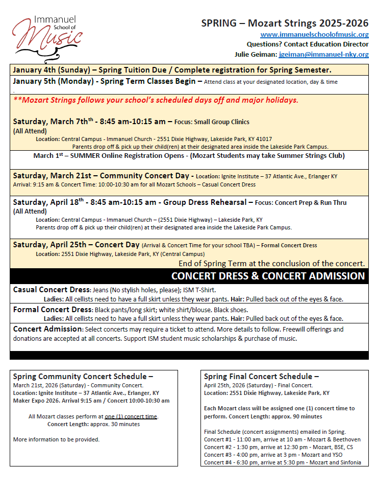 - Monday, May 17 - Chamber Players 2026 Auditions at ISM. Summer Flex Scheduling. (Final Concert August 1, 2026 at 4pm). Contact ismoffice@immanuel-nky.org for more information.
